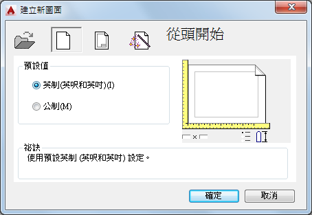 使用英制或公制預設設定從頭開始建立新圖面。「使用樣板」使用您在圖面樣板中所定義的設定,來建立新圖面。使用「精靈」建立新圖面,該圖面使用您在「快速」或「進階」精靈中指定的設定。(透過 NEW 指令無法使用該對話方塊中的第一個選項,即「開啟圖面」。)若要開啟既有的圖面,請使用 OPEN。)