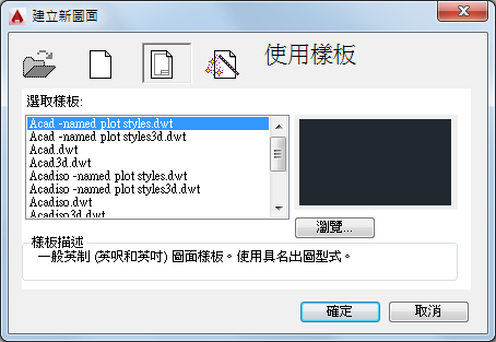 啟動基於圖面樣板檔的圖面。樣板圖面會儲存圖面的所有設定,同時可能包括預先定義的圖層、標註型式和視圖。樣板圖面以副檔名 .dwt 來與其他圖檔進行區分。它們一般儲存在 template 目錄下。