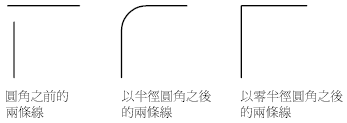 圓角半徑是連接圓角物件弧的半徑。變更圓角半徑將影響後續的圓角。如果將圓角半徑設定為 0,則圓角物件將被修剪或延伸直到它們相交,但並不建立弧。