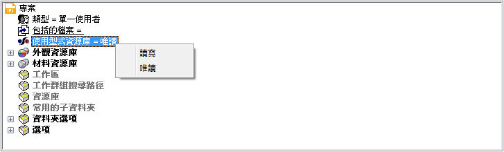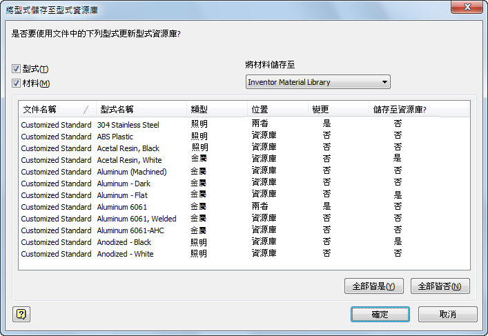 在 Inventor 2012 中,我們從專案檔案設定中移除了「使用型式資源庫 = 否」選項。從 Inventor 2012 起,如果型式與型式資源庫中的型式相符,我們會自動清除 Inventor 文件中的所有型式。如果在舊版本中根據自訂樣板而非型式資源庫定義一個自訂型式,請將「使用型式資源庫」設為「是」或「讀寫」,如以下影像中所示。此動作會將自訂樣板的自訂型式儲存至新版 Inventor 中的型式資源庫。