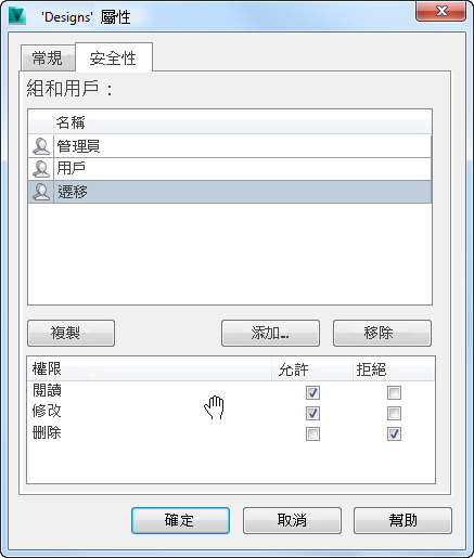 按照〈規劃料件生命週期安全性〉中定義的程序,將「Migration」使用者加入至料件生命週期安全性。為此使用者加入讀取和修改料件中所貼附文件的權限。在移轉程序期間,不應有刪除任何資料的需求。做為預防措施,請拒絕此權限。