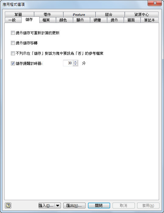 在「應用程式選項」的「儲存」頁籤上,您可以設定選項,讓系統在您開啟和關閉舊版 Inventor 檔案時提示您儲存和移轉檔案。