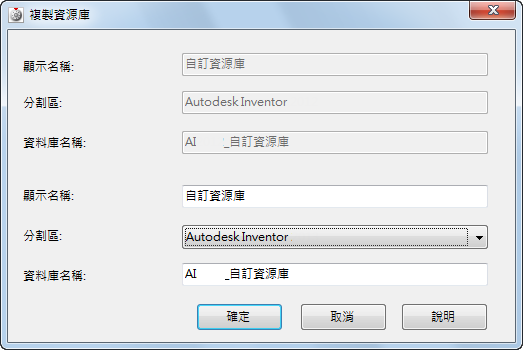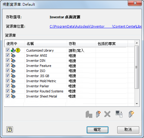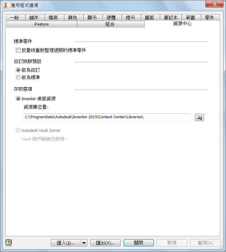 Inventor 桌面資源預設位置為 C:\ProgramData\Autodesk\Inventor <版本>\Content Center\Libraries 或 C:\Documents and Settings\All Users\Application Data\Autodesk\Inventor <版本>\Content Center\Libraries 資料夾。您可以透過「應用程式選項」的「資源中心」頁籤變更此預設位置。請參閱下圖。