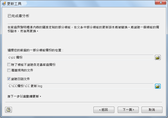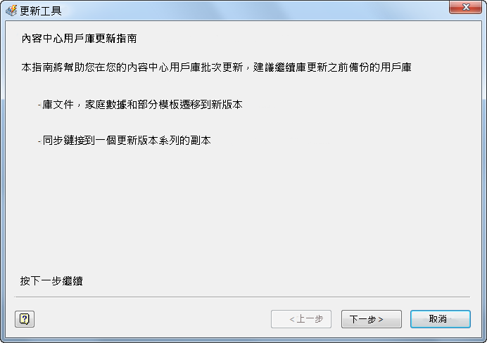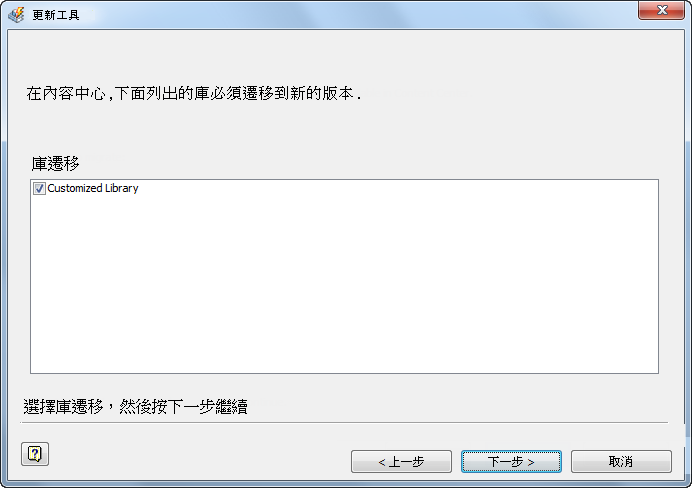 步驟 3:在「更新工具」對話方塊中,按「下一步」逐步執行程序,以完成自訂資源庫的移轉。