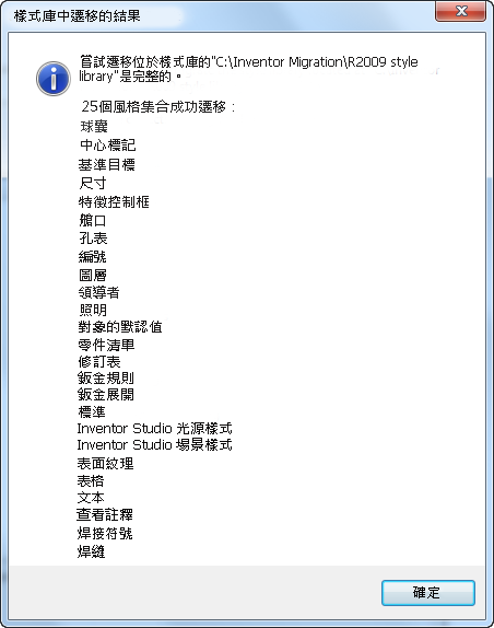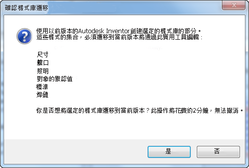 使用 Inventor 型式資源庫管理員,將目前型式資源庫移轉至新版 Autodesk Inventor。