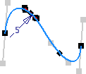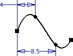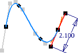 - 將無單位長度標註加入至作用中相切控點,以控制控點與雲形線相切的距離。初始標註值指示自然狀態。值通常在 0.5 和 2.0 之間。從標註 1.0 開始並觀察將其從 0.5 變更到 2.0 或更大的效果。