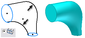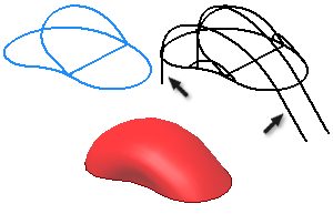 註: 較高的線粗值會導致斷面混成曲面扭曲,並產生自身相交的曲面。通常可以使用設定為 1 到 20 的線粗係數值來取得所需的造型。為儘可能減少造型失真,請在每個剖面上設定工作點。然後建構通過工作點的軌跡 (2D 曲線或 3D 曲線)。