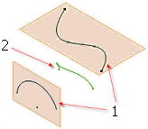 使用 3D 相交可選取兩個 2D 曲線,以在 3D 草圖中建立兩個平面曲線相交。產生的幾何圖形類似於從兩個擠出曲面建立的相交。 該範例將縣示選取的 2D 曲線 (1) 與產生的相交曲線 (2)。 |