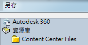 在檔案對話方塊 (例如:「另存」、「將複本儲存成」、「開啟」、「放置元件」和「建立元件」對話方塊) 中,您可以從位置面板的頂部,將檔案儲存至 Autodesk 360 並從中開啟檔案。可在包括位置面板的所有檔案對話方塊中存取 Autodesk 360。