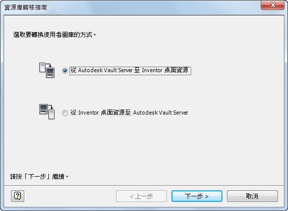 - 按一下「轉移資源庫指南...」按鈕,以啟動「轉移資源庫指南」對話方塊。請參閱圖 2。選取「從 Autodesk Vault Server 到 Inventor 桌面資源」。