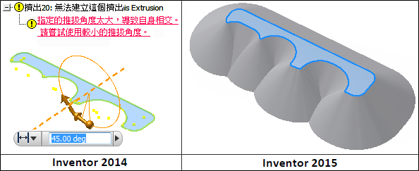 薄殼和推拔擠出的堅實度已得到改進。它們現在可處理更複雜的幾何圖形。例如,在 Inventor 2014,您可以使用適當的相切約束擠出以下輪廓,但推拔角度最大只能達到 27 度。在 Inventor 2015 中,推拔角度可以是 0 度到 90 度之間的任何值。