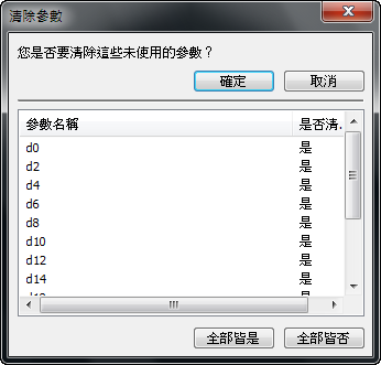 在「參數」對話方塊底部,「清除未使用項目」選項會將所有未使用的參數列示在單獨的視窗中。您可以在該視窗中一次清除這些參數。按一下「全部皆是」以刪除文件中所有未使用的型式,或按一下「全部皆否」以保留目前文件中未使用的型式。