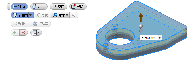 使用「直接編輯」可快速編輯零件。可以直接操控幾何圖形來調整模型特徵的大小、造型和/或位置。「直接編輯」可用於:
