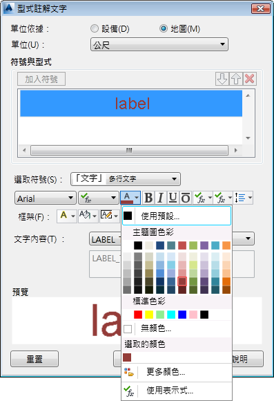 在此練習中,您將設定文字圖層型式,使其為粗體並變更其顏色。「設定文字圖層型式」對話方塊中有許多設定。其中大多數設定與圖徵資料來源相關聯,不應對這些設定進行變更。