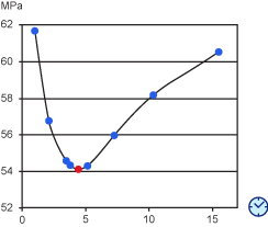 射壓隨射出時間的變化會造成兩種影響。首先,隨著射出時間從零開始增加,已熔解塑膠穿過零件所需的壓力會減小。其次,隨著射出時間的增加,由於熱傳導至模具造成黏度與凝固層厚度增加,聚合物溫度降低,射壓會增大。