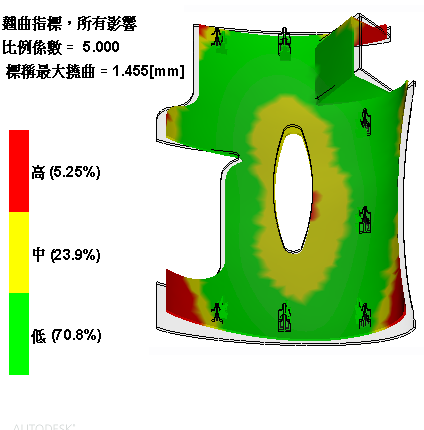 此結果展示零件翹曲的相對大小 (形狀的平面外變化)。綠色區域不到所引用的標稱最大撓曲的 80%,而紅色區域至少為該撓曲的 120%。標稱最大撓曲的預設值為零件平均壁厚的一半。將撓曲放大五倍,可以更醒目地查看撓曲。