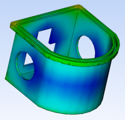 由於這些考慮事項,射出位置的一個可能位置是在零件底部的圓形邊上。使用「最佳澆口位置」結果可協助您從製程角度判斷此位置的適合度。