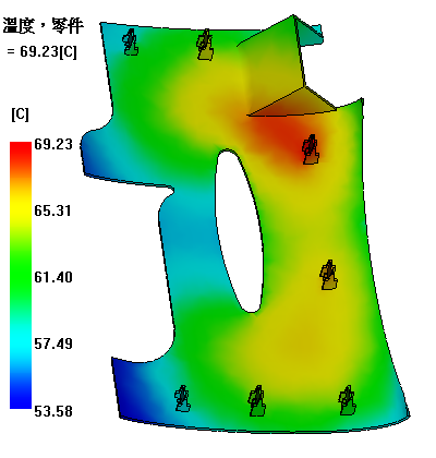 在此工作中,您將解釋「溫度,零件」結果。這些結果表示零件表面溫度在整個模具週期中的平均溫度。