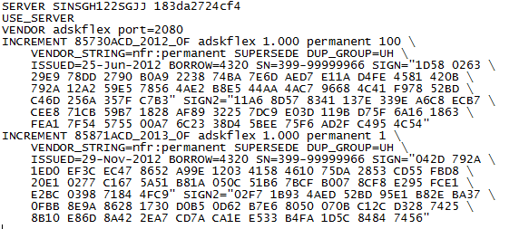 如果您要在相同的網路上執行多個產品序號,您將需要使用文字編輯器建立合併的授權檔。檔案中可包含相同 Autodesk 產品的不同版本,或不同 Autodesk 產品的功能代碼。