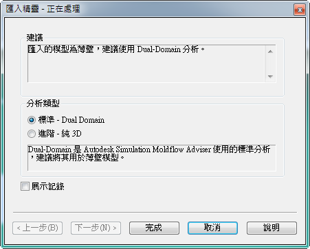 按一下「完成」,以接受「標準 - Dual Domain」做為分析類型。