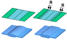 應根據肋曲線,以梯狀厚度值將這些肋特徵 (a) 塑型為區域 (b)。若要獲得梯狀曲線的最佳塑型效果,應為厚度轉換區域塑型,如下圖所示。為了避免解不穩定,流求解器會使轉換邊上節點任何一側的一個元素在一段距離範圍內其厚度步長更為流暢。透過包括轉換區域,可獲得肋曲線的更佳表現法。
