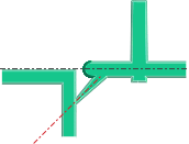 下潛式澆口用於兩板式模具建構。傾斜的錐形隧道位於分模線下,且從流道的一端連接至母模仁,如下圖所示。