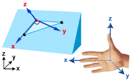 右手定則座標系的構成方式為,右手的拇指形成 Z 方向,中指形成 X 方向,手掌面向局部 Y 方向。