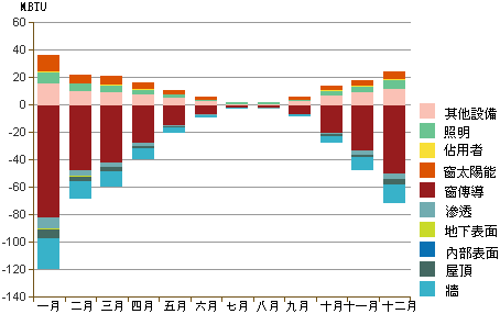 範例:在上面的範例圖表中,一月的最大負值是「窗傳導」。因此,通過窗傳導的熱損失表現出最大單月熱需求是一月。不過,「其他設備」(包括塞孔荷載、電腦、辦公設備等) 會減少熱需求。