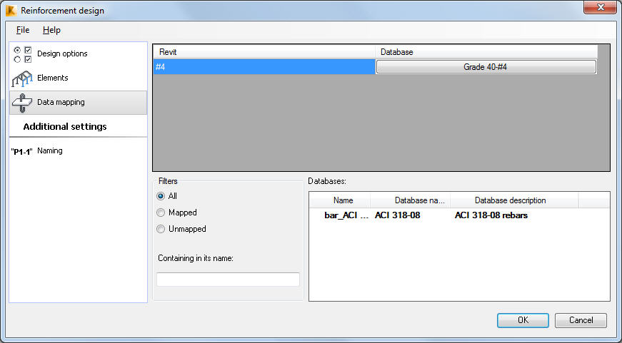 On this tab you can assign steel grades and diameters to reinforcing bars that you are exporting from Revit to Robot. It is significant when different lists of reinforcing bars are used in Revit and Robot.