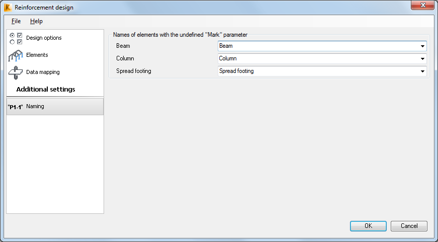 The Naming tab is available for design and verification modes. It applies only to elements for which the Mark parameter is not defined. Use it to define a name prefix for Robot RC elements.