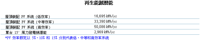 當審閱「結果和比較」對話方塊中的能源分析時,此表格會概述建築工址使用太陽能板和風力發電機可產生的電量。