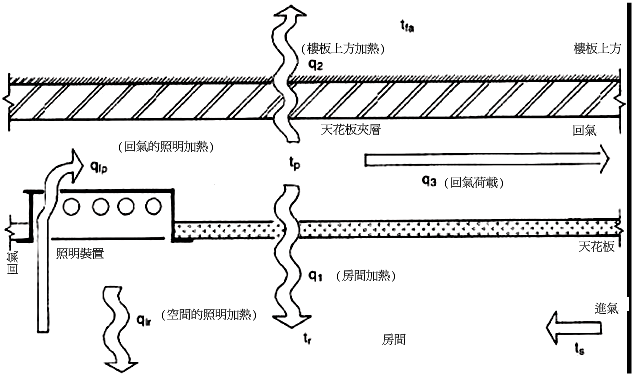 天花板上方的空間,當做為回氣路徑時,為天花板回氣靜壓箱。不同於傳統的管道式回氣,靜壓箱可能在路徑中具有多個熱源。這些熱源可能是來自照明與變壓器的輻射和對流荷載;來自相鄰牆、屋頂或玻璃的傳導荷載;或靜壓箱內的管道和配管系統。