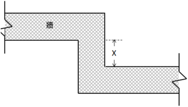 兩面牆作為內部空間邊界且它們之間的間隙為標註 X 的平面視圖