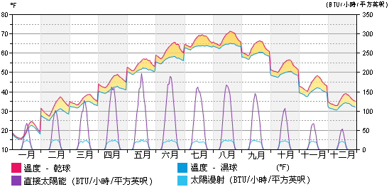 位於左側的 Y 軸是溫度,而位於右側的 Y 軸是太陽輻射 (每小時單位面積 BTU)。
