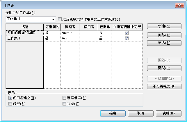 下圖展示「工作集」對話方塊,其中包含兩個預設的使用者建立工作集,分別是「共用的樓層和網格」和「工作集 1」。