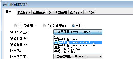 - 對於「連結視圖」,選取您要將連結模型中哪個視圖的顯示設定用於目前主體視圖中的連結模型。