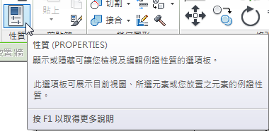 當您將游標停放在功能區中的工具上時,Revit 依預設會顯示工具提示。工具提示提供簡短的工具描述。如果把游標停放在功能區工具上更久一點,將顯示其他資訊 (如果有)。當工具提示可見時,可以按 F1 取得關聯式說明,其中提供關於該工具的更多資訊。
