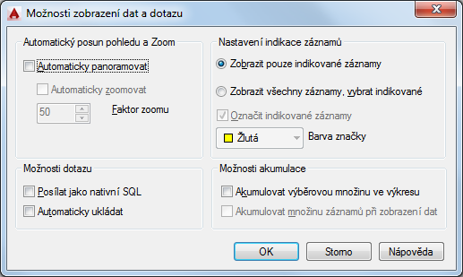 Přidává další záznamy k množině záznamů po výběru dalších grafických objektů. Pokud je tato možnost zrušena, okno Zobrazení dat označí pokaždé novou množinu záznamů, když vyberete novou množinu grafických objektů.