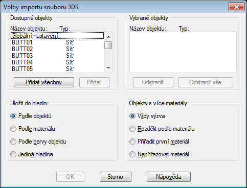 Vypíše seznam dostupných a vybraných 3D objektů, ukládá 3D objekty do hladin a pracuje s objekty s více materiály.