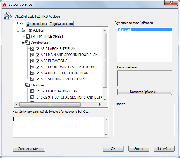 Zobrazí informace, které jsou obsaženy v přenosovém balíčku. Obsahuje všechny poznámky k přenosu, které jste vložili, a distribuční poznámky generované automaticky, které obsahují podrobnosti o krocích, které musí být provedeny, aby přenos správně fungoval. Pokud jsou například v některém výkresu pro přenos objevena písma SHX, dostanete pokyny, kam tyto soubory zkopírovat, aby je bylo možné detekovat na systému, pro který je přenos určen. Pokud jste vytvořili textový soubor výchozích poznámek, budou tyto poznámky také zahrnuty ve zprávě.
