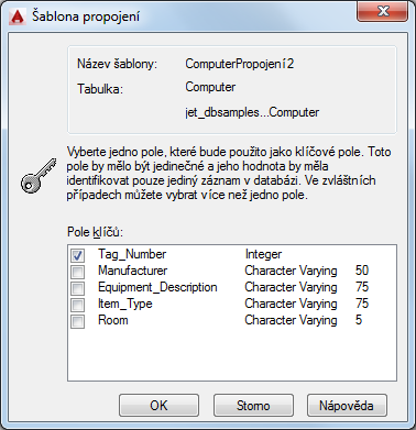 Zobrazí všechna pole, která jsou k dispozici pro aktuální databázovou tabulku, společně s typem pole a délkou pole v případě znakových polí. Klíčová pole šablony spojení určíte výběrem zaškrtávacího políčka vlevo od názvu pole.