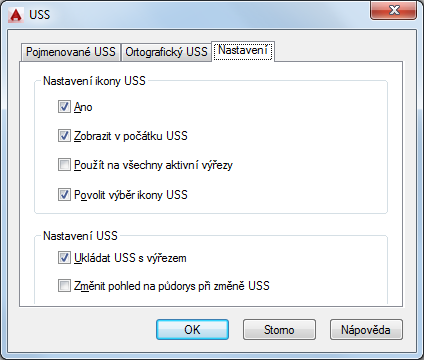 Slouží k uvedení, přejmenování a obnovení definic uživatelských souřadnicových systémů (USS) a řídí nastavení systému USS a ikony USS pro výřezy.