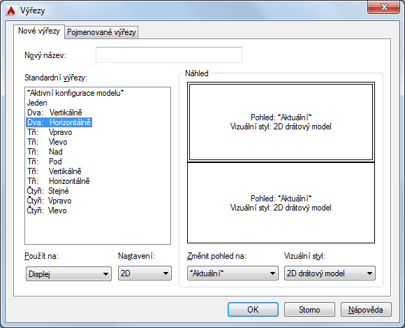 Určuje nastavení 2D nebo 3D. Pokud vyberete 2D, nová konfigurace výřezů je původně vytvořena s aktuálním pohledem ve všech výřezech. Pokud však vyberete 3D, na výřezy v konfiguraci se použije sada standardních ortogonálních 3D pohledů.
