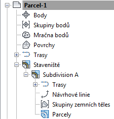 Výkres může zahrnovat libovolný počet stavenišť, ale každé staveniště má pouze jednu knihovnu parcel. Žádná jednoznačná parcela nemůže patřit k více než jednomu staveništi. Tyto vztahy můžete vidět v knihovně Staveniště v Prostoru nástrojů, na kartě Prospektor: