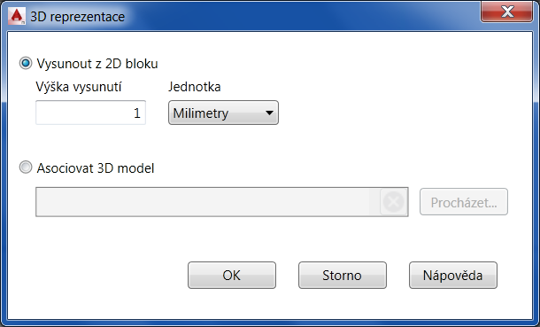 Toto téma popisuje dvě různé metody vytvoření 3D reprezentace z komponenty 2D bloku. Oba postupy se provádějí pomocí dialogu 3D reprezentace. Jakmile je 3D model úspěšně asociován s blokem, lze jej importovat a nastavit jeho správnou orientaci.