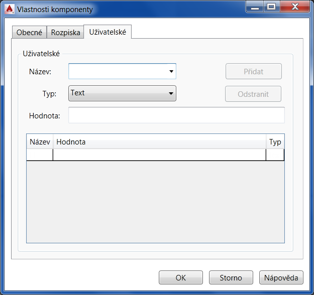 - Pomocí karty Uživatelské lze přidávat uživatelské vlastnosti za účelem klasifikace, správy a vyhledávání komponenty. Pole Název určuje název nové uživatelské vlastnosti a umožňuje výběr existující uživatelské vlastnosti ze účelem úprav. Zadejte název nebo klikněte na šipku a vyberte název v rozevíracím seznamu. Pole Typ definuje datový typ vlastnosti. Klikněte na šipku a vyberte položku v rozevíracím seznamu. Textové pole Hodnota určuje hodnotu vlastnosti komponenty. Hodnota musí odpovídat vybranému datovému typu. V seznamu Vlastnosti se zobrazují názvy, hodnoty a typy aktuálně definovaných uživatelských vlastností komponenty. Pomocí tlačítka Přidat lze přidat název vlastní uživatelské komponenty. Pomocí tlačítka Odstranit lze vybranou vlastnost odstranit ze seznamu Vlastnosti.
