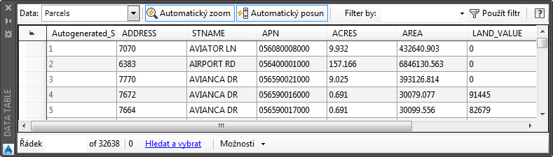 Posunutím zobrazení doprava zobrazte všechny sloupce dat parcel.