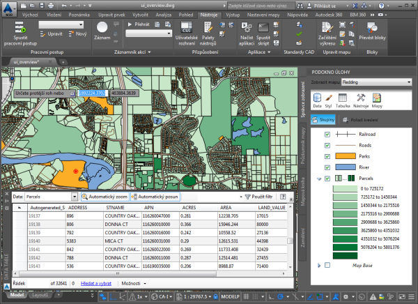 Tato mapa je opatřena hladinami Správce zobrazení pro železnice, silnice, parky, řeku a parcely. Každá je stylizovaná odlišně. Informace o jednotlivých součástech okna aplikace AutoCAD Map 3D naleznete v lekci 2: Rychlá prohlídka aplikace AutoCAD Map 3D.