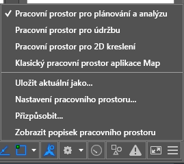 Je možné upravit existující pracovní prostor nebo vytvořit nový. Pro různé úkoly můžete uložit různé pracovní prostory, aby se tím zjednodušily obvyklé úkoly nebo nastavit nejlepší postupy pro mapové úkoly a pracovní postupy.