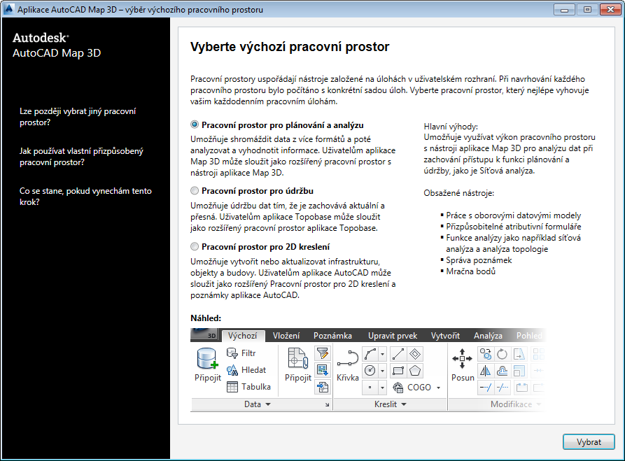 Při prvním spuštění aplikace AutoCAD Map 3D vyberte výchozí pracovní prostor.